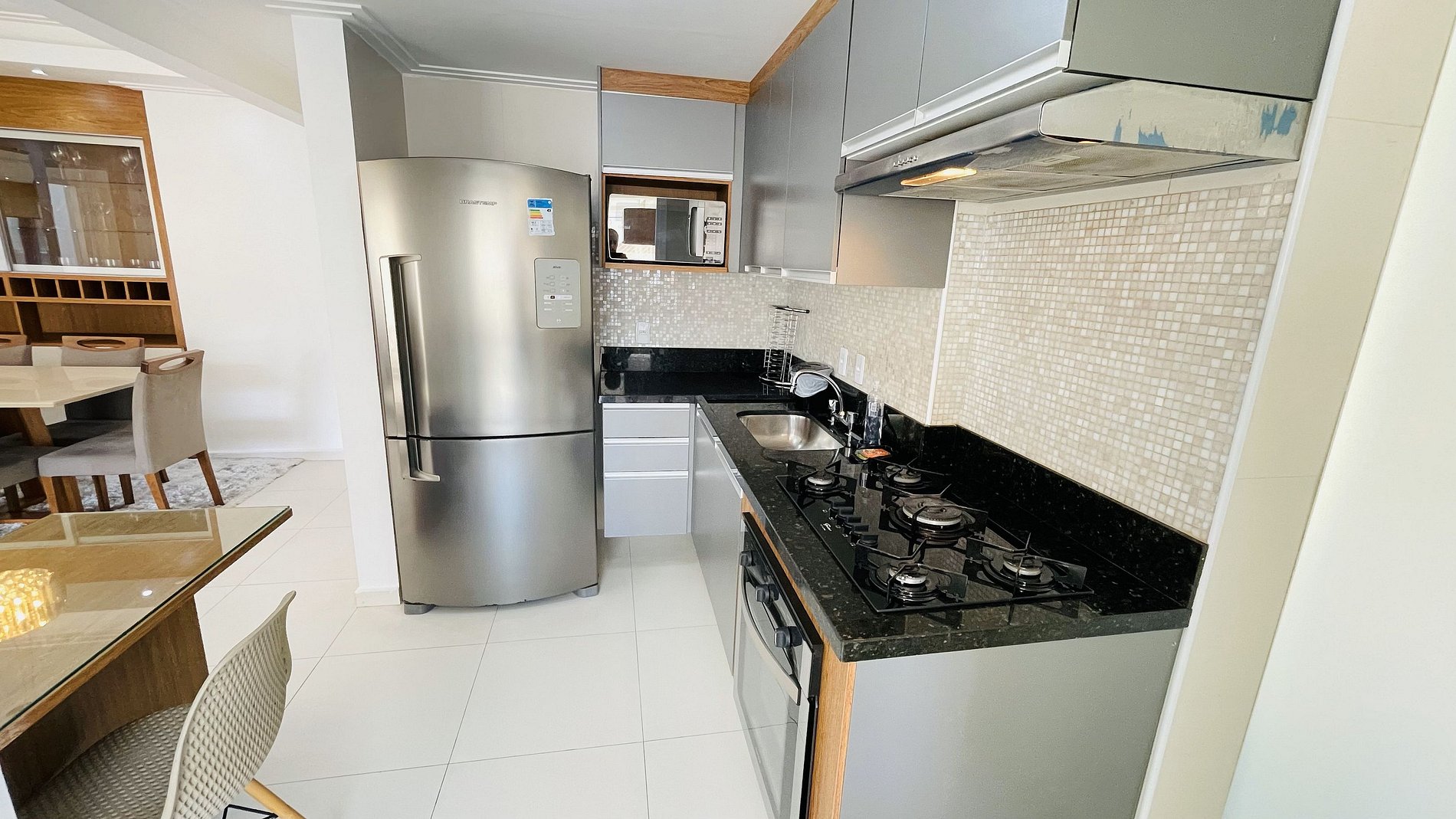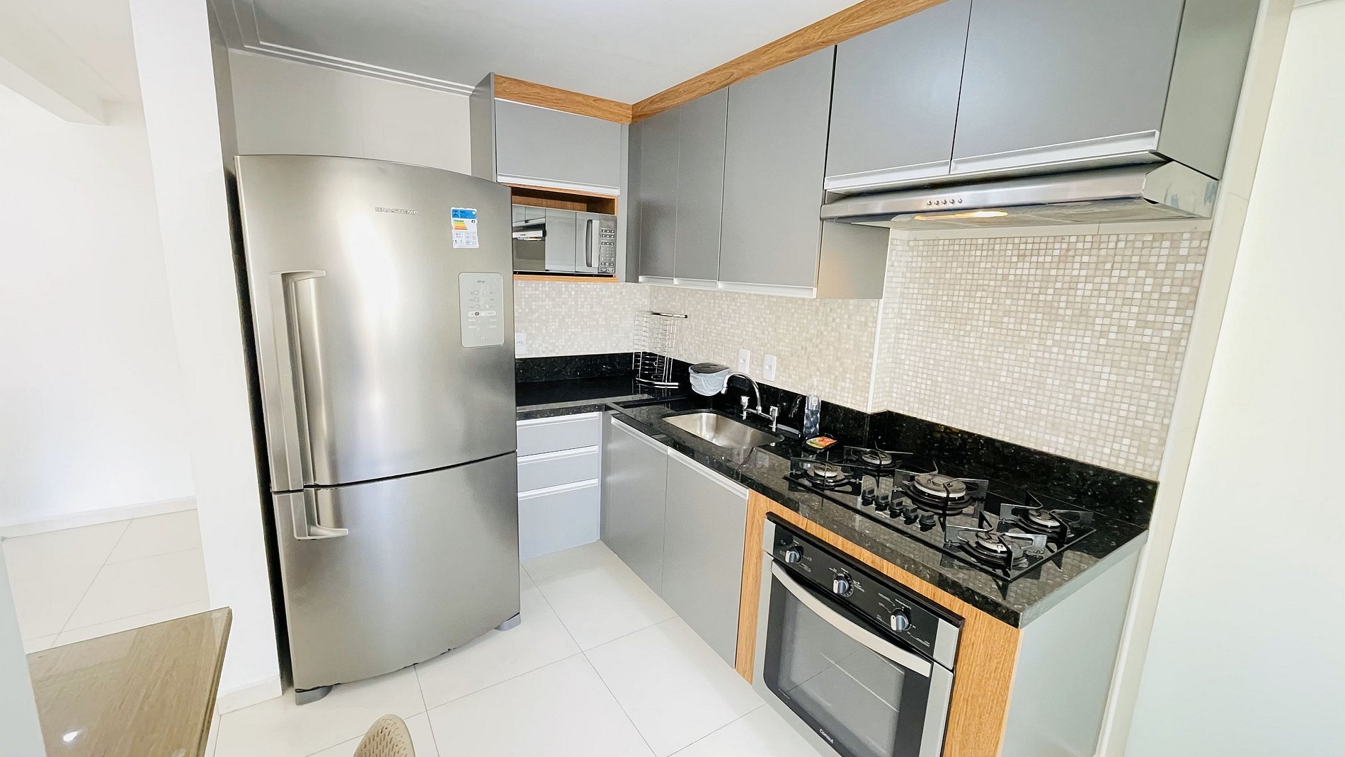 Este imóvel está equipado com utensílios de cozinha, eletrodomésticos como geladeira, fogão, máquina de lavar e eletroportáteis como cafeteira, liquidificador, micro-ondas, ferro de passar e secador de cabelo.